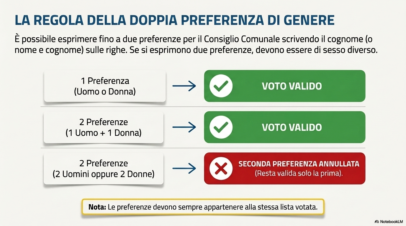 Preferenze per il Consiglio Comunale: si possono esprimere fino a un massimo di due preferenze scrivendo il cognome dei candidati nelle righe a fianco del simbolo della lista votata. Attenzione: in caso di due preferenze, devono riguardare candidati di genere diverso (un uomo e una donna) della stessa lista, pena la nullità della seconda preferenza.