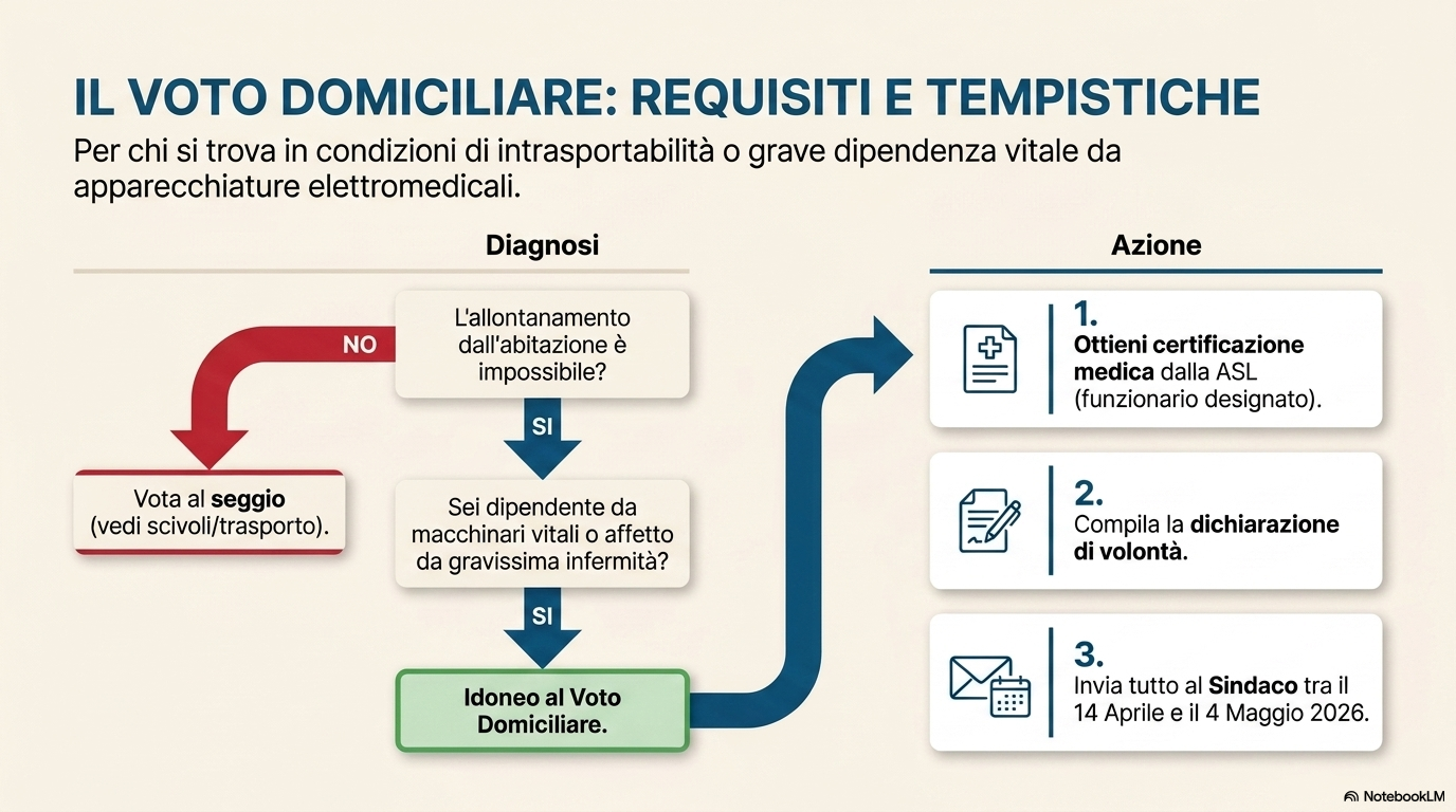 Voto domiciliare: riservato a elettori affetti da gravissime infermità o dipendenza vitale da apparecchiature elettromedicali. La domanda deve essere inviata al Sindaco tra martedì 14 aprile e lunedì 4 maggio 2026, corredata da certificazione sanitaria dell'ASP.