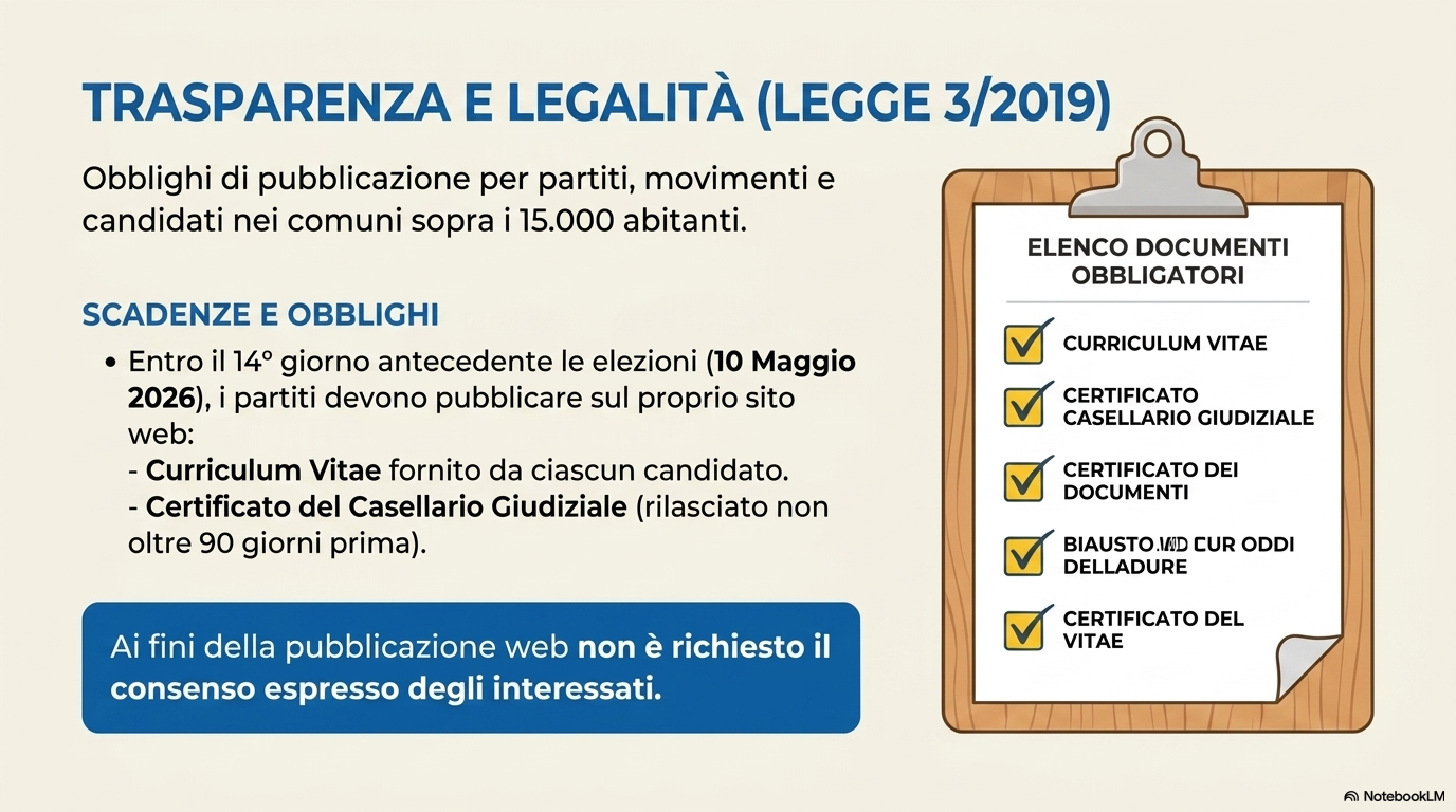 OBBLIGHI DI TRASPARENZA DEI CANDIDATI In base alla Legge n. 3/2019, per i comuni sopra i 15.000 abitanti, i partiti e le liste hanno l'obbligo di pubblicare sul proprio sito internet: