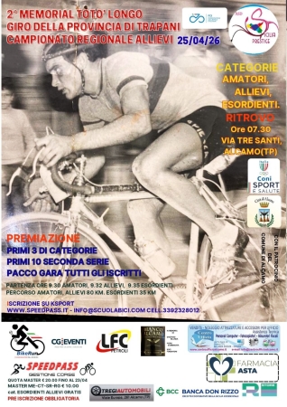 Sabato 25 aprile Alcamo ospiterà la seconda edizione del “Memorial Totò Longo”, il giro ciclistico della provincia di Trapani valido come prova unica del campionato regionale allievi M. La manifestazione è riservata alle categorie Master, Allievi ed Esordienti ed è organizzata dall’Associazione Sportiva Dilettantistica Sicilia Prestige con il patrocinio del Comune.