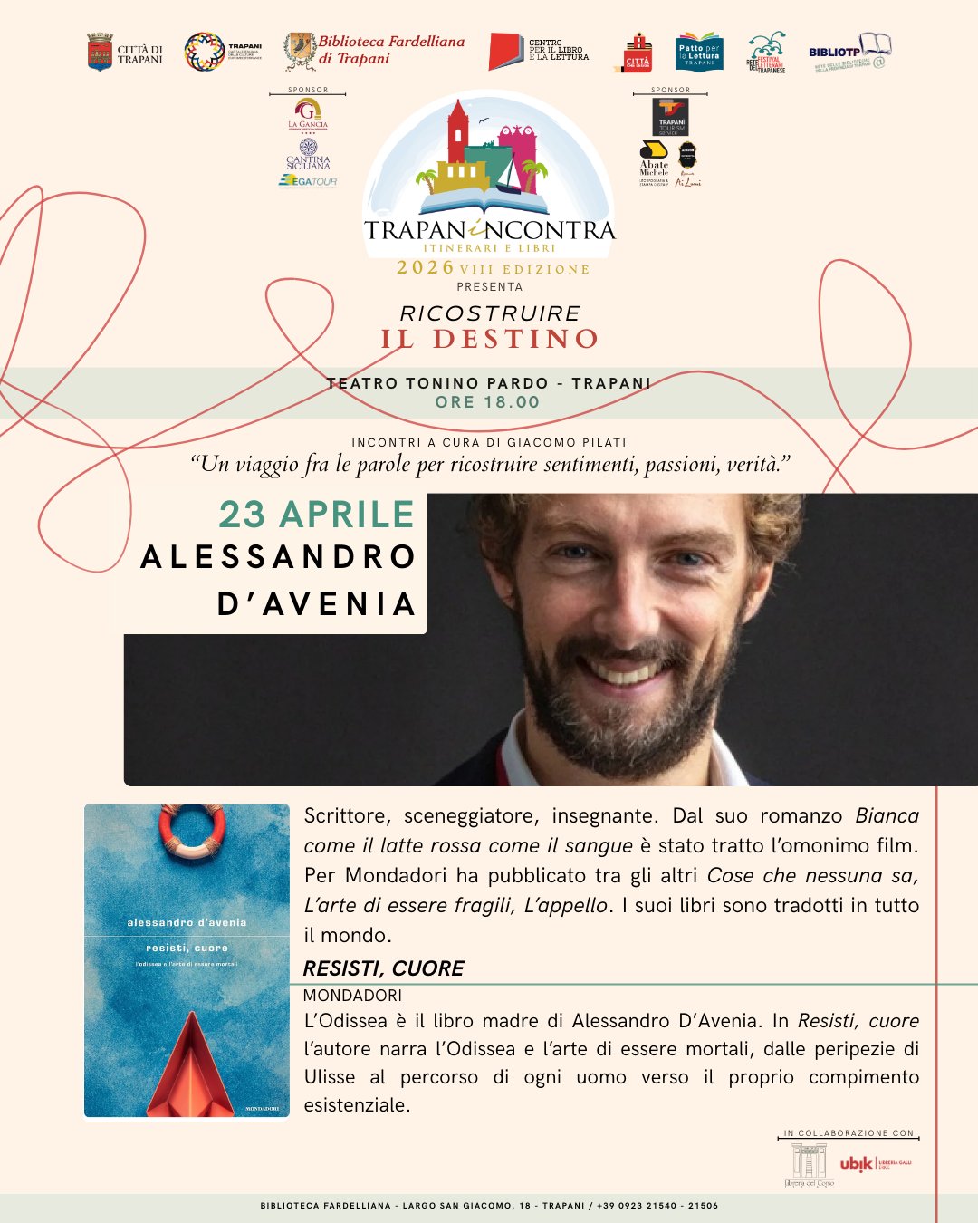 Nella Giornata mondiale del libro, TrapanIncontra ospita uno degli autori più noti del panorama italiano. Oggi, 23 aprile, alle ore 18 al Teatro Tonino Pardo, Alessandro D’Avenia porta in scena il monologo “Resisti, cuore - L’Odissea e l’arte di essere mortali”, tratto dal suo omonimo libro.