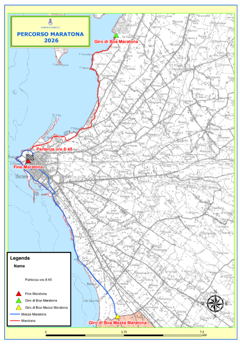 Gli atleti - che pertanto non si fermeranno in Piazza della Vittoria - proseguiranno su Viale Cesare Battisti, Via Honor Frost, Via C. Vito Falco, Lungomare Salinella Battaglia delle Egadi, Via Giacomo dell’Orto, S.P. 84 fino a Villa Genna, Lungomare Spagnola fino a mt. 100 dopo l’imbarcadero Storico di Mothia (giro di boa), ritorno sul medesimo itinerario, fino al Lungomare Boeo, Viale Isonzo e arrivo in Piazza della Vittoria (previsione, ore 15:00 circa).