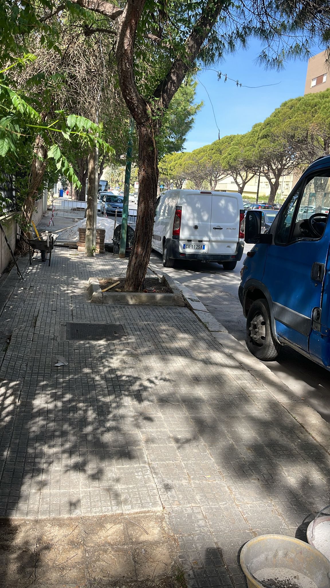 Accanto alle radici dei pini, resta infatti aperta la questione dei pali dell’illuminazione pubblica collocati in più punti in stretta interferenza con alberi e aiuole, elemento che continua a comprimere il passaggio pedonale e a creare restringimenti anche laddove il marciapiede verrà rifatto.
