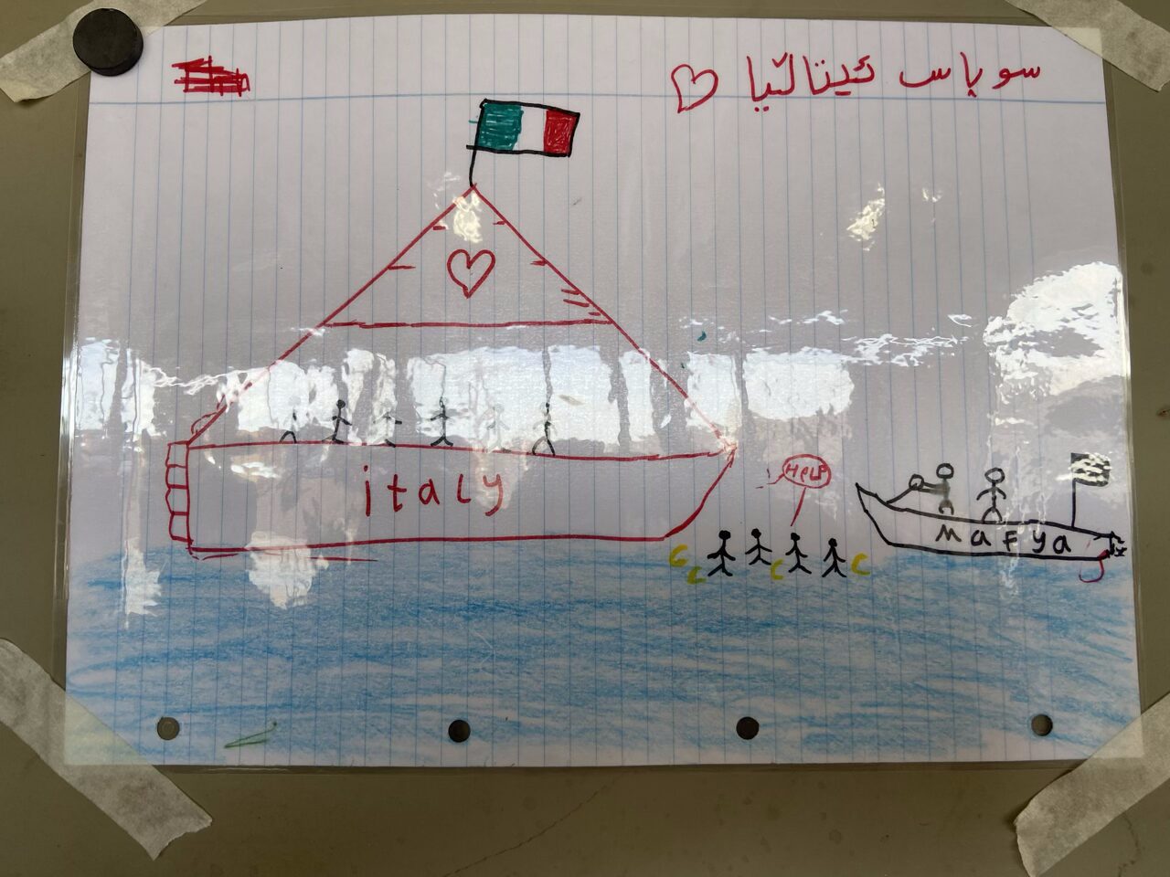 Disegnano la nave, le persone che li stanno accogliendo, la gioia improvvisa di essere ancora vivi.