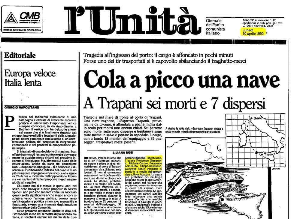 Era il 29 aprile 1990. Trapani celebrava San Francesco di Paola, patrono dei marinai. Il porto era immerso nella bonaccia, il mare piatto come l’olio, il vento appena percettibile. In città ci si preparava alla processione e ai festeggiamenti del pomeriggio.