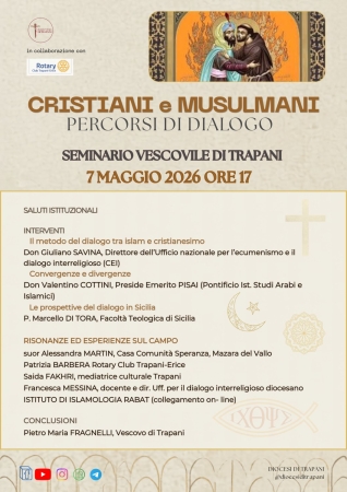 Un confronto aperto tra cristianesimo e islam per andare oltre stereotipi e incomprensioni. Si terrà giovedì 7 maggio, alle ore 17, al Seminario vescovile di Trapani (Casa Santa, Erice) il seminario “Cristiani e musulmani, percorsi di dialogo”, promosso dalla Diocesi di Trapani in collaborazione con il Rotary Club Trapani-Erice.