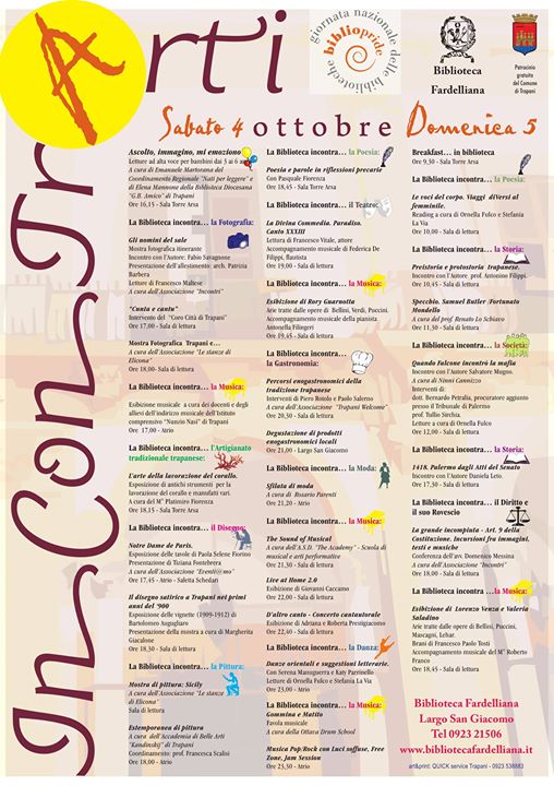 Nell’ambito della III Giornata Nazionale della Biblioteche - Bibliopride 2014, promossa dalla Associazione Italiana Biblioteche in tutto il territorio nazionale per ribadire l’importanza del sistema bibliotecario nazionale per la crescita culturale, economica e sociale del nostro Paese, la Biblioteca Fardelliana, in sinergia con diversi Enti ed Associazioni culturali, al fine di promuovere nel nostro territorio la cultura in tutte le sue varie sfaccettature, organizza per sabato e domenica 4/5 ottobre, due intense giornate di incontri, mostre e momenti di spettacolo con il coinvolgimento di decine di artisti, letterati ed operatori di alcuni settori produttivi locali, come l’artigianato e l’enogastronomia.