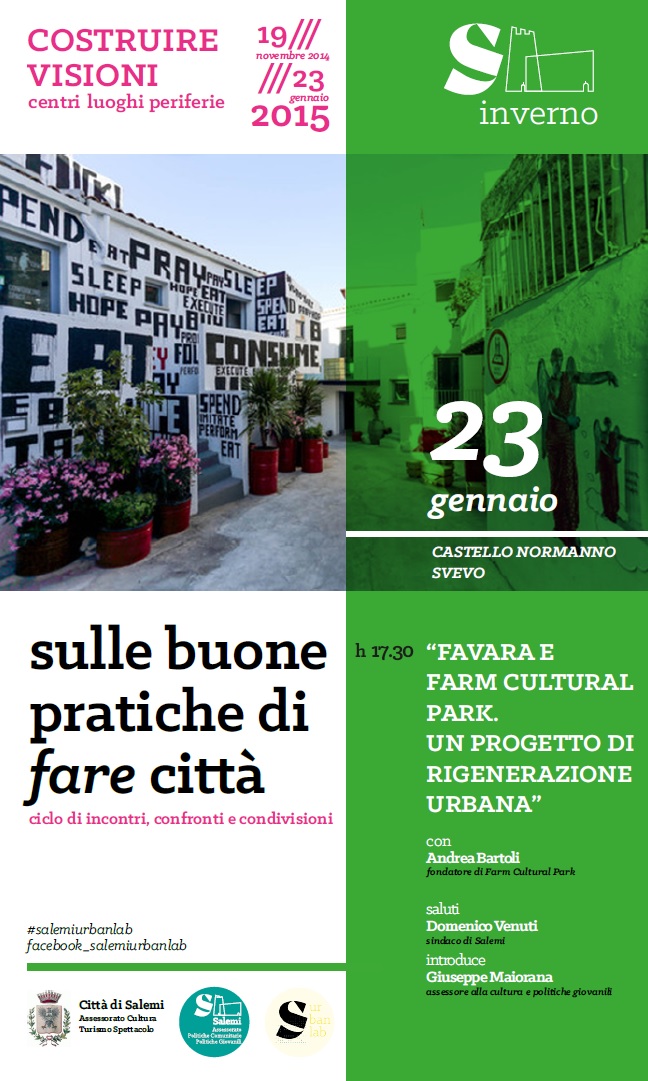 Conoscere e diffondere esempi e pratiche virtuose di valorizzazione di centri storici, a partiredall'esperienza della cittadina agrigentina di Favara. E' questo l'obiettivo dell'incontro 'Favara e Farm Cultural Park', un progetto di rigenerazione urbana', che si terrà venerdì, a partire dalle 17.30, all'interno della sala conferenze del Castello Normanno-Svevo di Salemi, in provincia di Trapani. Si tratta della quarta iniziativa del ciclo denominato “Sulle buone pratiche di fare città”, promosso dal Laboratorio per le politiche giovanili 'Salemi Urban Lab', guidato dall'assessore alle Politiche giovanili del Comune di Salemi, Giuseppe Maiorana.