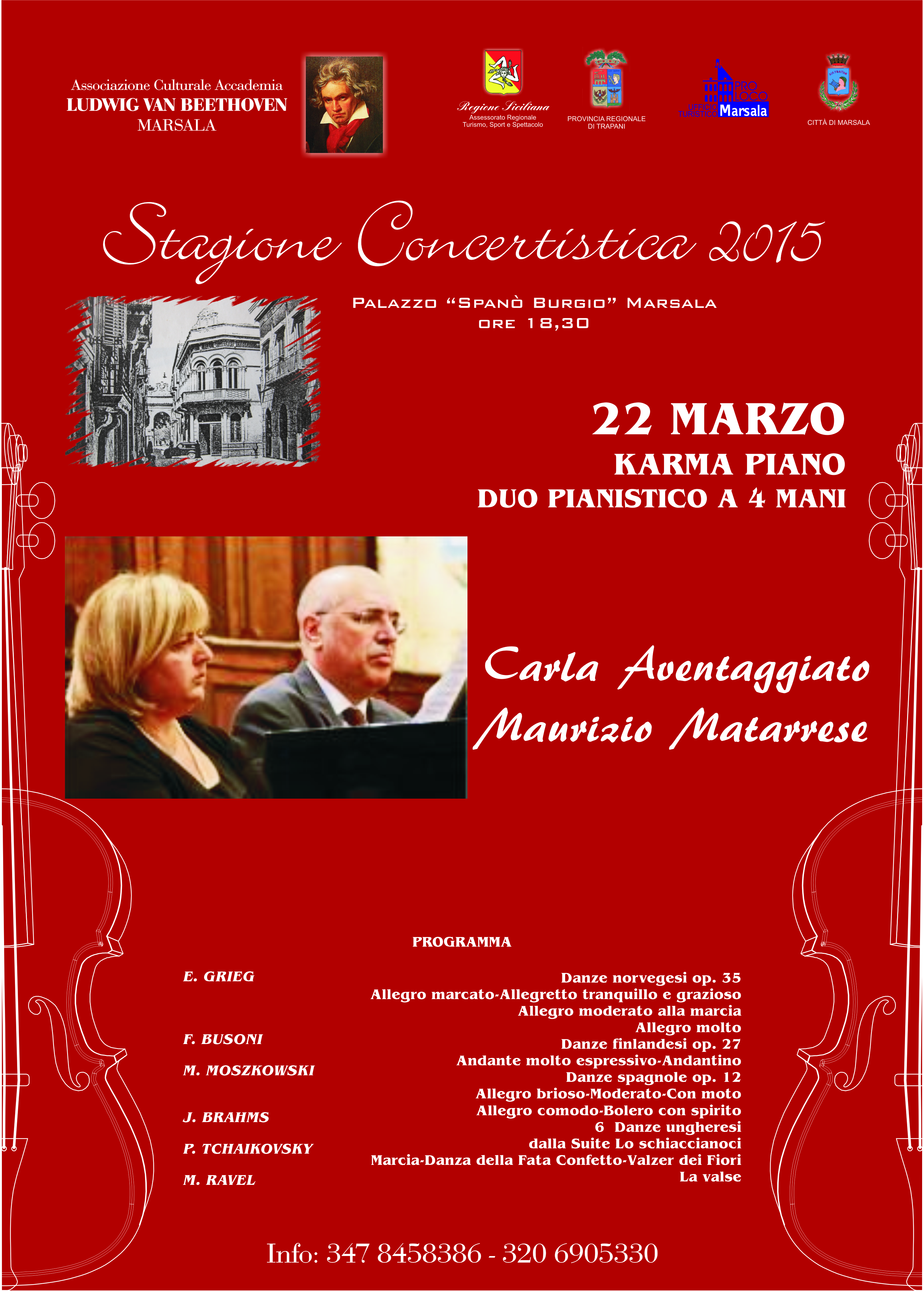 Domenica 22 marzo ore 18,30 presso il palazzo Burgio di Marsala concerto del duo pianistico Aventaggiato-Matarrese per XV stagione concertistica promossa dall'associazione Beethoven, con il patrocinio del comune di Marsala e dell'Ass. to Regionale Turismo, Sport e Spettacolo. Il duo, già conosciuto nel panorama internazionale per essersi esibito nei più prestigiosi teatri italiani e stranieri, proporrà un programma particolarmente accattivante con musiche di Grieg, Brahms, Tchaikowski, Ravel.