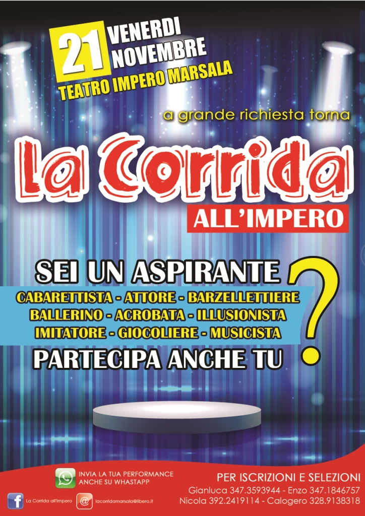 Ritorna "La Corrida all'Impero", lo spettacolo divertente di amatori alla ribalta. Organizzata anche quest'anno da Gianluca Galfano, Enzo Amato, Nicola Anastasi e per la prima volta anche da Calogero Ferreri. Lo spettacolo si svolgerà al Teatro Impero di Marsala, venerdì 21 novembre, con inizio alle ore 21.