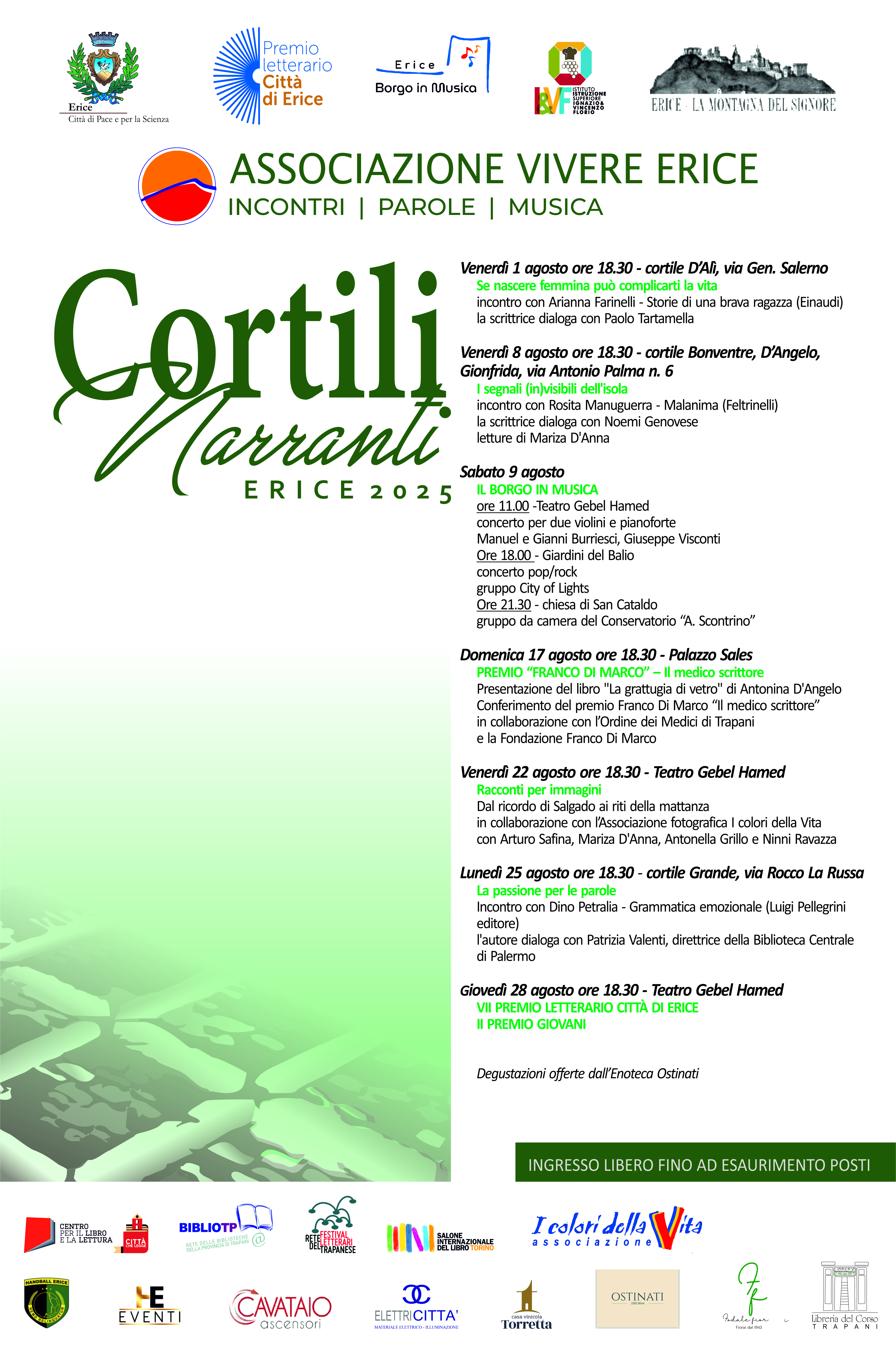 Dal 1° al 28 agosto si svolge a Erice la nuova edizione della rassegna culturale Cortili Narranti, promossa dall’associazione Vivere Erice. In programma incontri con scrittori, concerti, proiezioni fotografiche e due Premi letterari. Tra gli ospiti: Arianna Farinelli (Storia di una brava ragazza), Rosita Manuguerra (Malanima), Dino Petralia (Grammatica emozionale). Il 9 agosto torna “Borgo in Musica” con tre concerti in giornata. Il 22 agosto omaggio fotografico a Sebastiano Salgado. Gran finale il 28 agosto con la premiazione del VII Premio Letterario Città di Erice e del II Premio Giovani: vincitrici Vanessa Tonnini e Simona Lo Iacono. Tutti gli eventi sono gratuiti e si concludono con degustazioni di vini. Programma completo su www.vivereerice.it.