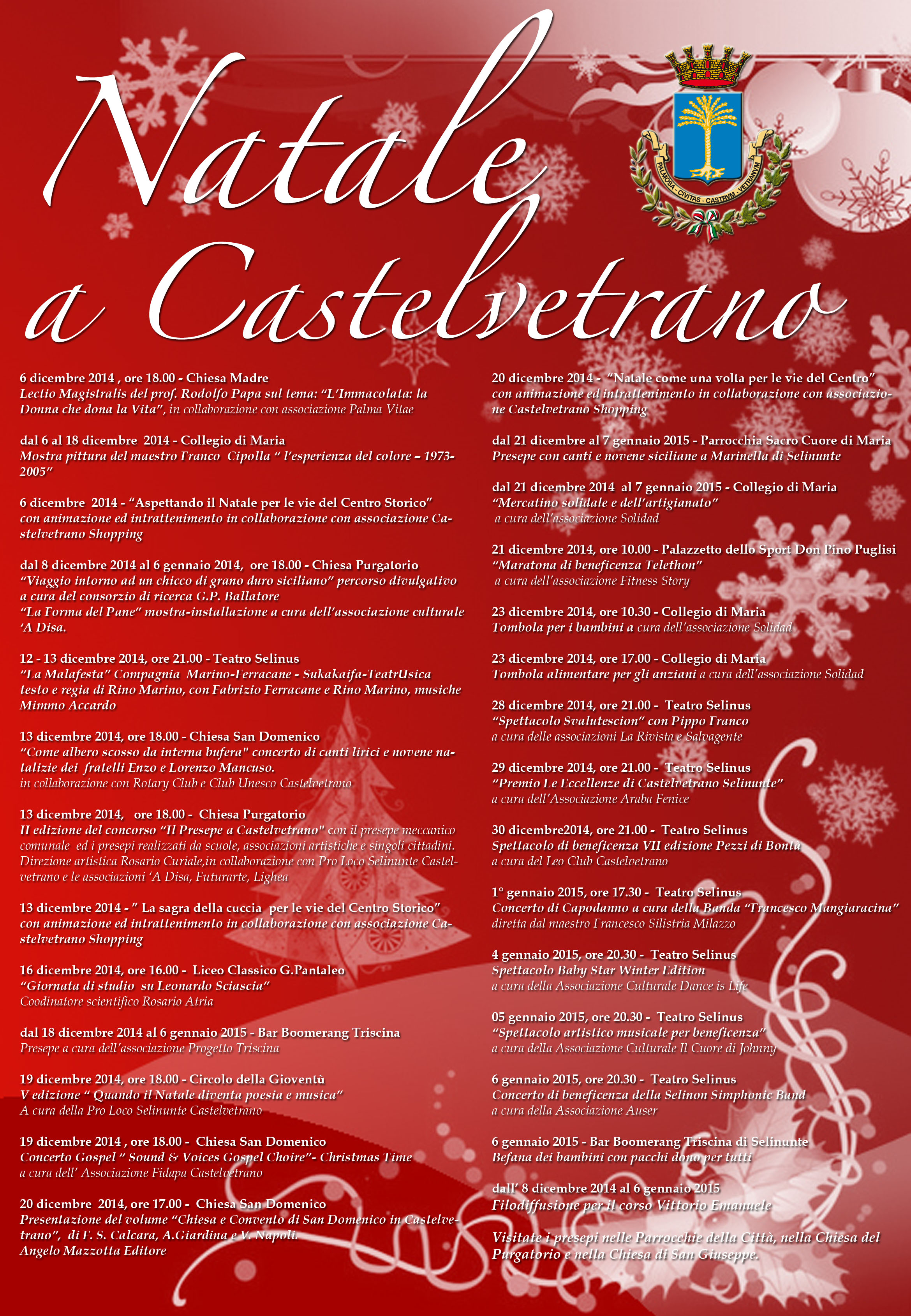 Il Sindaco della città di Castelvetrano Selinunte, Avv. Felice Errante, ha reso noto il calendario delle manifestazioni natalizie che si terranno in città e nelle borgate marinare in occasione delle imminenti festività natalizie .