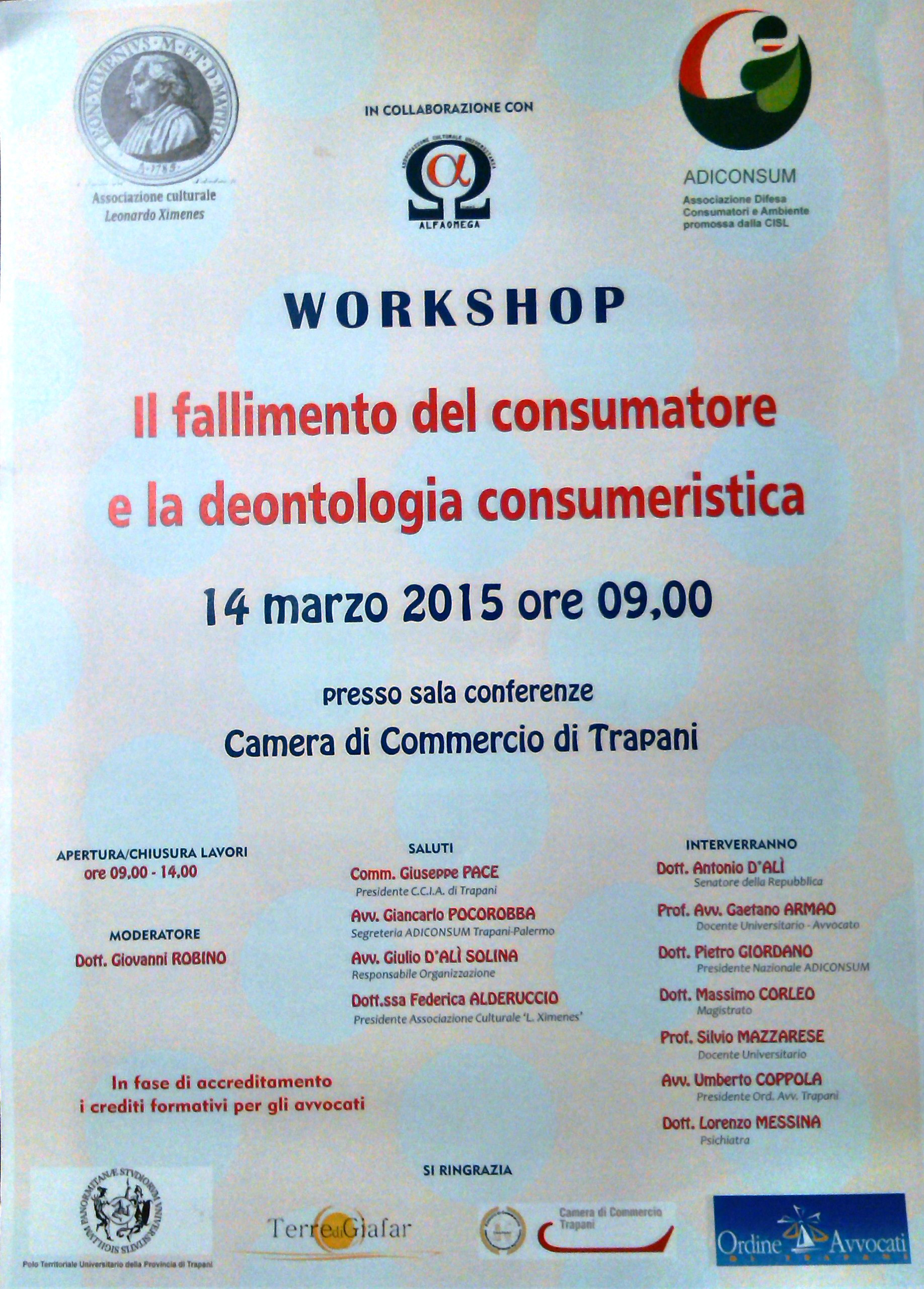 "Il fallimento del consumatore e la deontologia consumeristica". E' il titolo del convegno che si terrà sabato, a partire dalle 9, presso la sala conferenze della Camera di Commercio di Trapani. Interverranno, tra gli altri, il presidente dell'Ente Camerale, Pino Pace, il Senatore Antonio D'Alì, il magistrato Massimo Corleo e i docenti universitari Gaetano Armao e Silvio Mazzarese. L'evento è organizzato dall'Associazione Culturale Ximenes, in collaborazione con Alfaomega e Adiconsum.