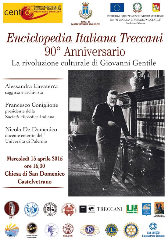 Ricorrendo nel 2015 il novantesimo anniversario della fondazione dell’Istituto dell’Enciclopedia Italiana, ad opera di Giovanni Treccani (e su suggerimento di Giovanni Gentile, che ne divenne il direttore scientifico), mercoledì 15 aprile 2015, alle 16.30, si terrà, a cura del Centro Internazionale di Cultura Filosofica “Giovanni Gentile”, a Castelvetrano, presso la chiesa di San Domenico, una giornata di studio sul tema “L’Enciclopedia Italiana ‘Treccani’ nel novantesimo anniversario – La rivoluzione culturale di Giovanni Gentile”.