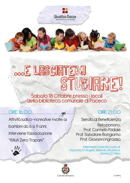 L’Associazione socioculturale Quattro Rocce è lieta di comunicare la sua prossima iniziativa: “…e lasciatemi studiare!” è il progetto che l’Associazione realizzerà Sabato 18 Ottobre, presso i locali della Biblioteca Comunale di Paceco. Per facilitare il compito del Comune, impegnato come ogni anno nell’aiutare, in ambito di spese scolastiche, le famiglie meno agiate del territorio, l’Associazione ha organizzato una serata di beneficenza che vedrà l’intervento dei Professori Salvatore Bongiorno, Giovanni Ingrassia e Carmelo Fodale. La serata, allietata da esibizioni musicali a cura di Monica D’Aleo, Giacomo D’Angelo e Stefania Alcamo, sarà preceduta da un pomeriggio tutto dedicato ai più piccoli: a partire dalle ore 16:00 bambini di tutte le età potranno partecipare ad attività ludico-ricreative organizzate dall’Associazione. Grazie alla partecipazione straordinaria dell’Associazione “Rifiuti Zero Trapani”, inoltre, verrà toccato il tema del riciclo, coinvolgendo attivamente i piccoli partecipanti.