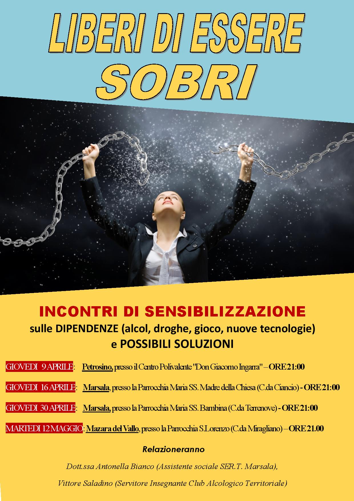 “Liberi di essere sobri” è il titolo del ciclo di quattro incontri organizzati dal Club Alcologico Territoriale di Marsala. Il primo si terrà a Petrosino, giovedì 9 aprile alle ore 21.00, presso il Centro Polivalente ‘Giacomo Ingarra’.