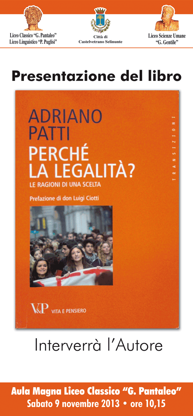 I Licei di Castelvetrano in collaborazione con il Comune presentano il libro di Adriano Patti "Perchè la legalità. Le ragioni di una scelta". All'incontro che si terrà sabato 9 novembre nell'aula magna del Liceo Classico "G. Pantaleo" parteciperà l'autore. La prefazione del libro di Patti è di Don Luigi Ciotti, anima dell'associazione libera.
