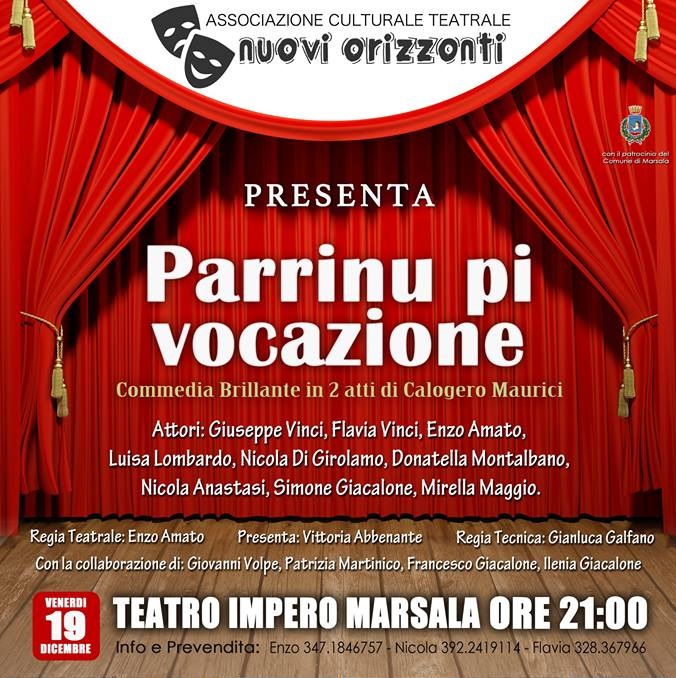 L'associazione teatrale "Nuovi Orizzonti" di Marsala, venerdì 19 dicembre rappresenterà la commedia brillante "Parrinu pi vocazione" al Teatro Impero, con inizio alle ore 21.15. Presenta la serata Vittoria Abbenante.
