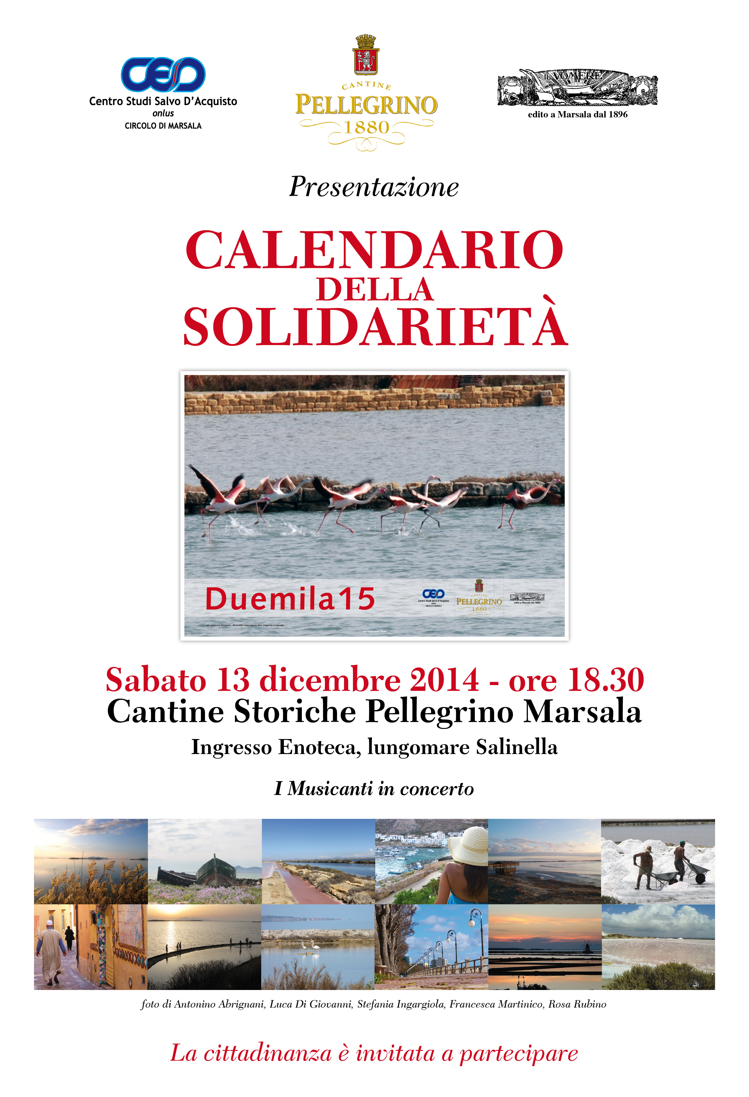 Il Calendario della Solidarietà 2015 sarà presentato sabato 13 dicembre, alle ore 18,30, nelle storiche Cantine Pellegrino. L’iniziativa è del Centro Studi Salvo D’acquisto onlus Circolo di Marsala, delle Cantine Pellegrino e del Vomere.