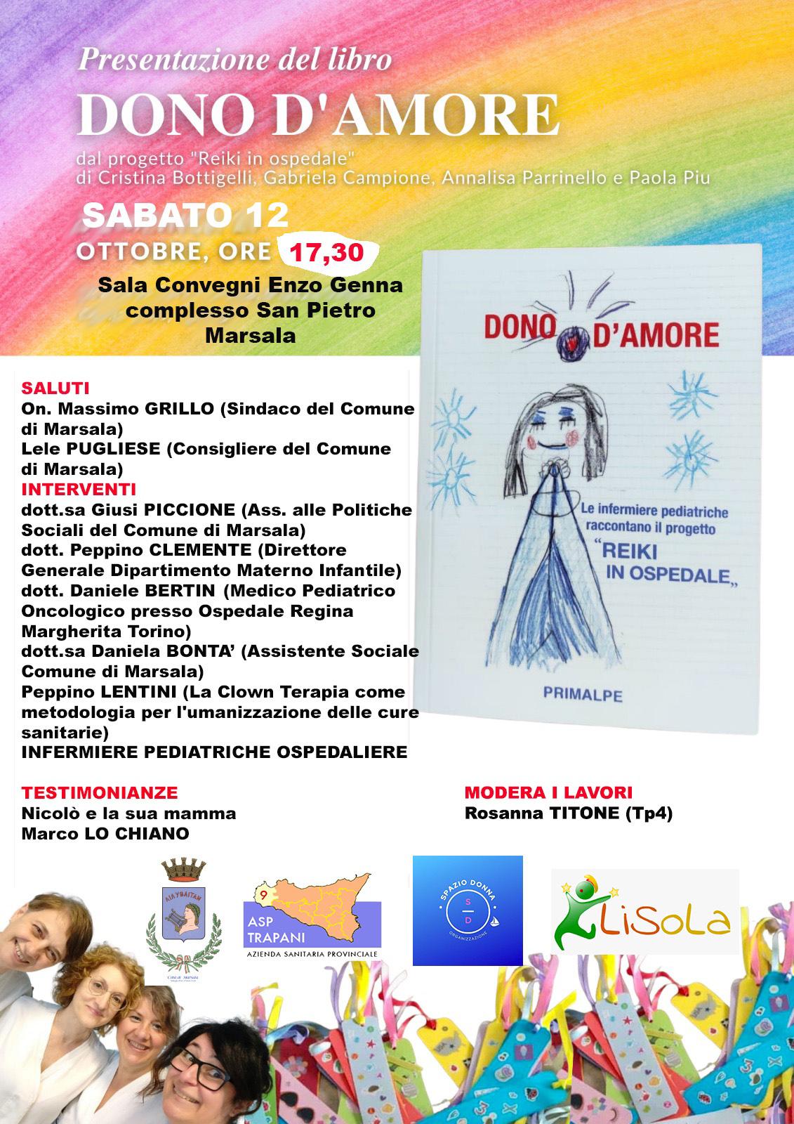 Sabato 12 ottobre, alle ore 17:30, presso la Sala Convegni Enzo Genna del complesso San Pietro a Marsala, si terrà la presentazione del libro "Dono d'Amore", nato dal progetto "Reiki in Ospedale". Il testo è stato scritto da Cristina Bottigelli, Gabriela Campione, Annalisa Parrinello e Paola Piu, e racconta il ruolo delle infermiere pediatriche nell'umanizzazione delle cure attraverso il Reiki, una pratica che mira al benessere psico-fisico dei pazienti.