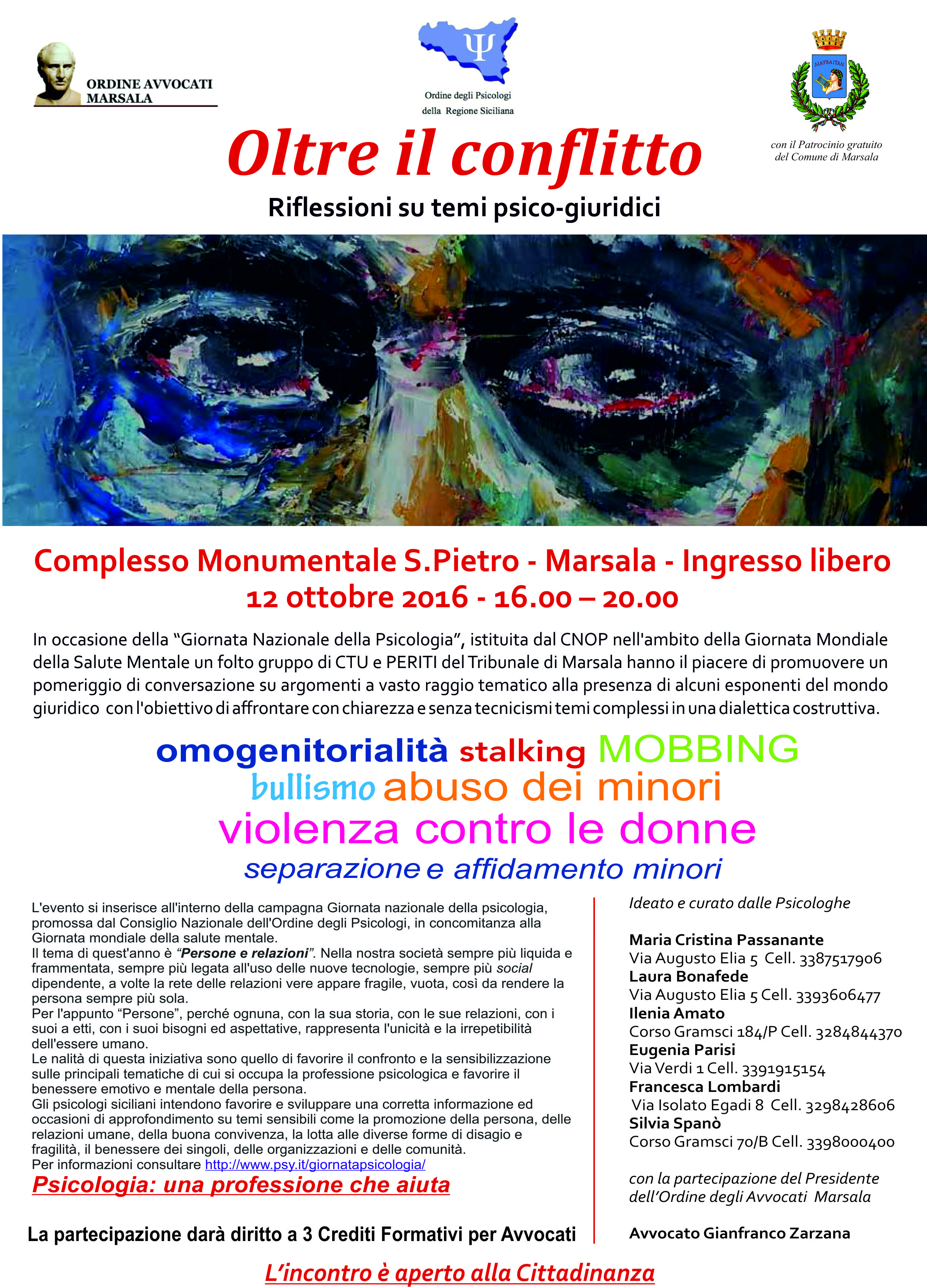 Mercoledì 12 ottobre al Complesso Monumentale S.Pietro di Marsala, il convegno "Oltre il conflitto Riflessioni su temi psico-giuridici".
