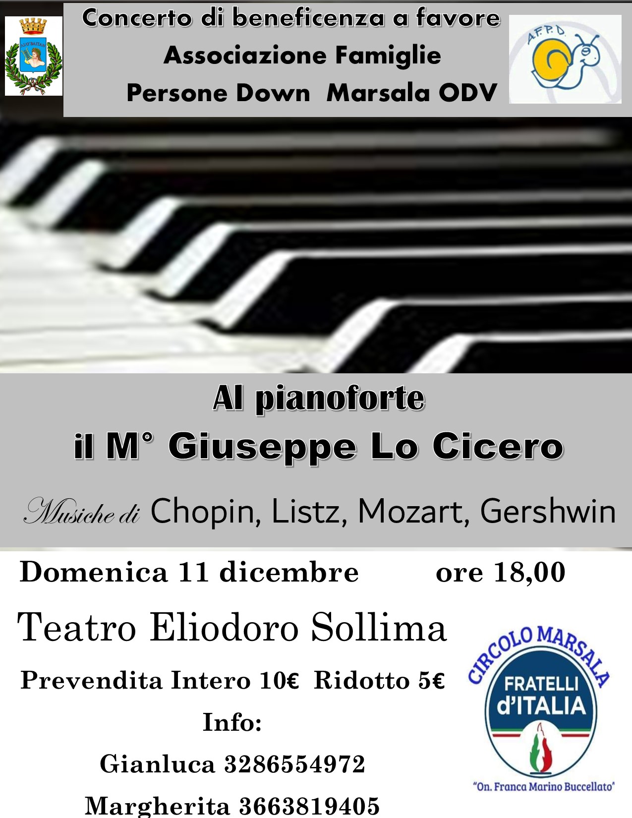 Fratelli d'Italia organizza un concerto di beneficenza a favore dell’Associazione Persone Down Marsala – ODV. Sul palco il M° Giuseppe Lo Cicero eseguirà al pianoforte brani di Chopin, Lizt, Mozart e Gershwin.