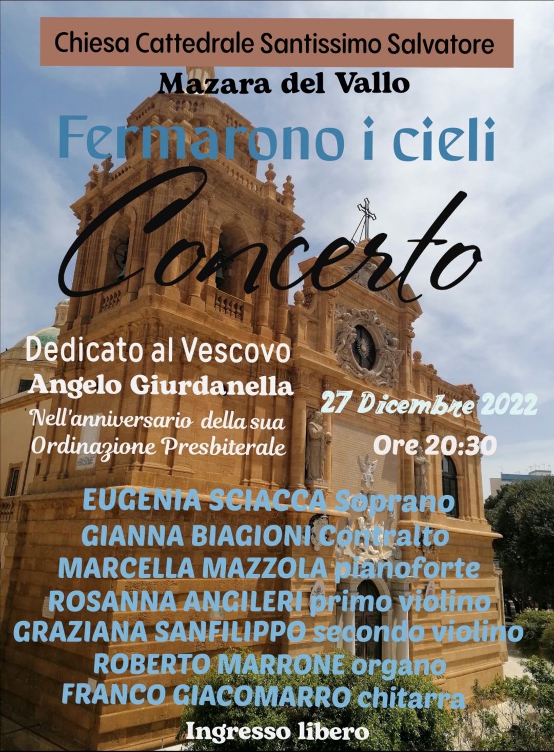 Martedì 27 dicembre 2022 in Cattedrale a Mazara del Vallo il concerto "Fermarono i cieli". Ingresso libero previsto per le ore 20,30.