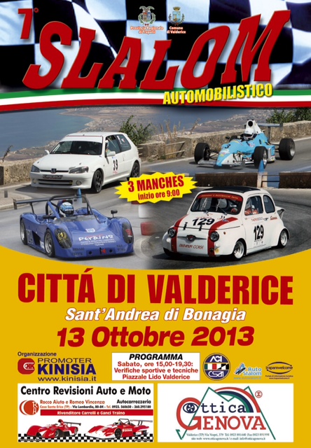 Domenica 13 ottobre, dopo qualche anno di assenza, lo Slalom “Città di Valderice” con la sua settima edizione. La prova, organizzata in passato dalla Drepanum Corse, passa il testimone al Promoter Kinisia. Numerosi gli iscritti ad oggi con nomi illustri locali e regionali. La corsa si svolgerà lungo un percorso di 2750 metri da Sant’ Andrea di Bonagia a Valderice su cui verranno collocate 9 postazioni di rallentamento a 4 birilli. Lo slalom si articolerà in tre manche cronometrate. A dirigere la gara Giovanni Stallone. Il programma prevede per sabato 12 ottobre le verifiche sportive e tecniche a Lido Valderice (dalle ore 15.00alle 19.30). Domenica mattina alle ore 9:00 il via della prima manche. I tempi e le classifiche saranno disponibili sul sito www.kinisia.it . La premiazione si svolgerà al Teatro San Barnaba a Valderice alle ore 15.30.