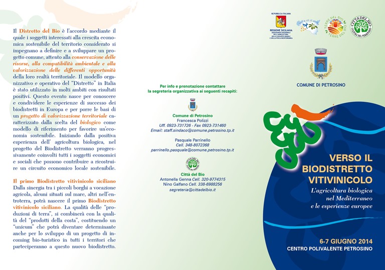 Il progetto del Biodistretto si basa su esperienze simili già promosse da Città del Bio in diverse realtà italiane ed europee, che si caratterizzano per la scelta del biologico come modello di riferimento per un’economia sostenibile. Ciò vale ancora di più per un territorio come quello di Petrosino e degli altri Comuni del territorio trapanese, particolarmente vocati alla produzione agricola. A partire dalle tante produzioni agricole del territorio (vino, olio, agrumi, fragole, meloni, etc..), il Biodistretto sarà lo strumento per una valorizzazione territoriale in chiave bio. Per realizzare tutto questo bisognerà mettere in rete le diverse realtà che operano sul territorio: dalle aziende agricole a quelle che lavorano nella trasformazione o nella commercializzazione dei prodotti, dagli enti locali a quanti operano nell'ambito della ristorazione e dell'ospitalità. Con l'intenzione di mettere a confronto tutti i soggetti interessati al progetto, il Comune di Petrosino e Città del Bio hanno in programma il convegno "Verso il Biodistretto vitivinicolo. L'agricoltura biologica nel Mediterraneo e le esperienze europee" che si svolgerà il 6 e 7 giugno presso il Centro Polivalente di Petrosino. L'incontro è rivolto alla cittadinanza, agli operatori economici e ai rappresentanti degli enti locali: tutti coinvolti a vario titolo nella costituzione del biodistretto vitivinicolo.