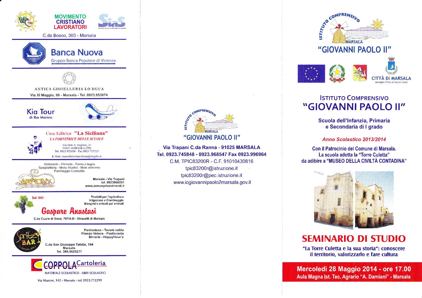 Mercoledì 28 maggio alle ore 17.00, presso l'Aula Magna dell'Istituto Tecnico Agrario "Abele Damiani" di Marsala, si terrà il Seminario di Studio "La Torre Culletta e la sua storia": conoscere il territorio, valorizzarlo e fare cultura. Il seminario è curato dall'Istituto Comprensivo "Giovanni Paolo II", Scuola dell'Infanzia
