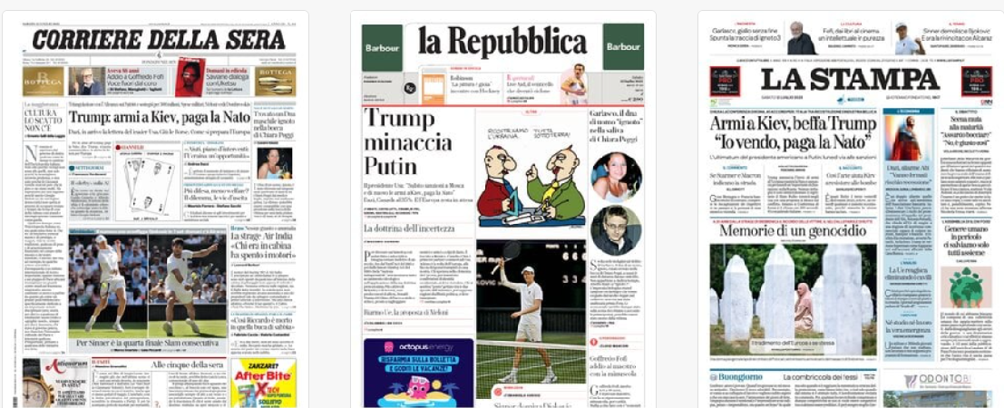 Titoli Corriere della Sera: Trump: armi a Kiev, paga la Nato la Repubblica: Trump / minaccia / Putin La Stampa: Armi a Kiev, beffa Trump / “Io vendo, paga la Nato” Il Sole 24 Ore: Giorgetti: le banche facciano più credito / Patuelli: anticipato il taglio dei tassi Bce Avvenire: Più missili che mattoni Il Messaggero: Armi Usa a Kiev, paga la Nato Il Giornale: Garlasco, altro pasticcio / Spunta un dna misterioso Qn: Trump alza il tiro sui dazi / Ma la Ue cerca l’accordo Il Fatto: Caso tangenti in Sicilia: / La Russa citato 27 volte Libero: Stangata Ue sul fumo La Verità: L’Ue prova a tramare col Colle / per esautorare il Parlamento Il Mattino: Trump: armi a Kiev, paga la Nato il Quotidiano del Sud: Dazi, giochiamo all’attacco il manifesto: Fare fuoco Domani: Le armi per Kiev le paga la Nato / L’Europa alle strette pure sui dazi