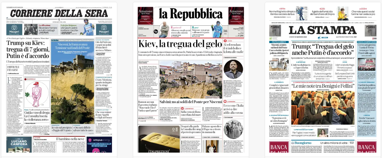 Titoli Corriere della Sera: Trump su Kiev: / tregua di 7 giorni / Putin è d’accordo la Repubblica: Kiev, la tregua del gelo La Stampa: Trump: “Tregua del gelo / anche Putin è d’accordo” Il Sole 24 Ore: Isee e aiuti alle Pmi: ecco il Dl Pnrr Avvenire: Il responso su Gaza Il Messaggero: Ucraina, la tregua del gelo Il Giornale: Mascherine, Covid / e quei 13 milioni / Gli affari Cina-M5s Leggo: «Niscemi è peggio del Vajont» Qn: Referendum, ricorsi bocciati / Confermata la data di marzo Il Fatto: Bongiorno&C: separare / parlamentari e avvocati Libero: Olimpiadi, al Pd l’oro dei cretini La Verità: Il gioielliere costretto a pagare / il danno biologico al rapinatore Il Mattino: Mosca-Kiev, la tregua del gelo il Quotidiano del Sud: Trump, la tregua del gelo il manifesto: Il conto Domani: Niscemi e i progetti mai finanziati / Musumeci nel mirino: «Si dimetta»