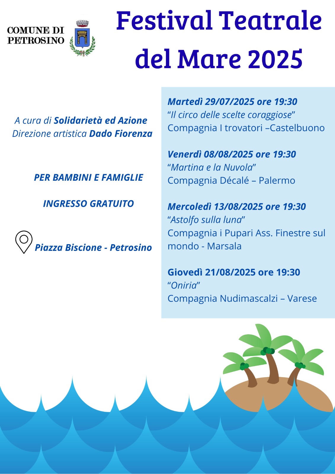 Il Comune di Petrosino inaugura una nuova rassegna estiva tutta dedicata ai più piccoli e alle loro famiglie: è il “Festival Teatrale del Mare 2025”, una serie di spettacoli gratuiti che animeranno Piazza Biscione fino ad agosto.