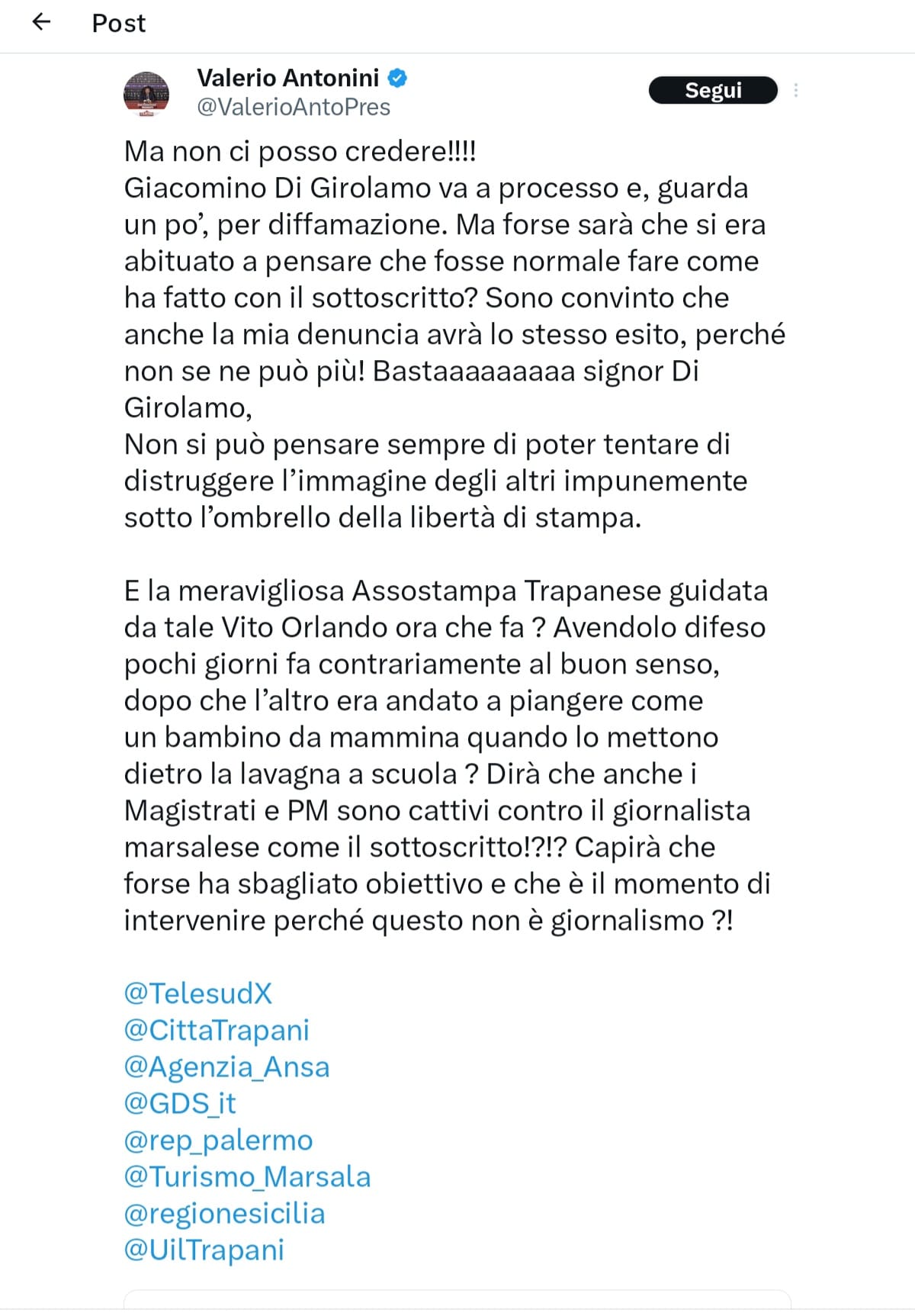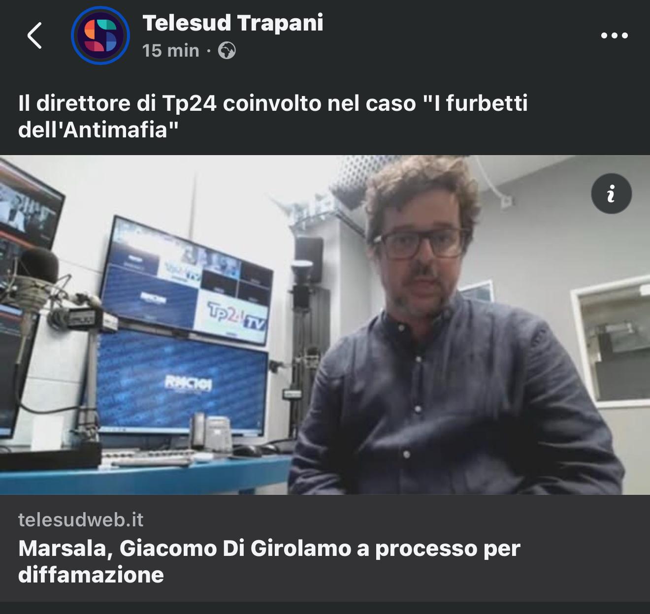 Telesud ha titolato: "Giacomo Di Girolamo a processo per diffamazione" il suo articolo. Ma nel post sui social scrive, fate attezione: "Il direttore di Tp24 coinvolto nel caso “I furbetti dell’Antimafia”’. Capite la differenza? E' come quando Trump (che insieme a Bisignani, è il punto di riferimento di Antonini) rinfaccia a Zelensky di aver cominciato lui per primo la guerra in Ucraina ...