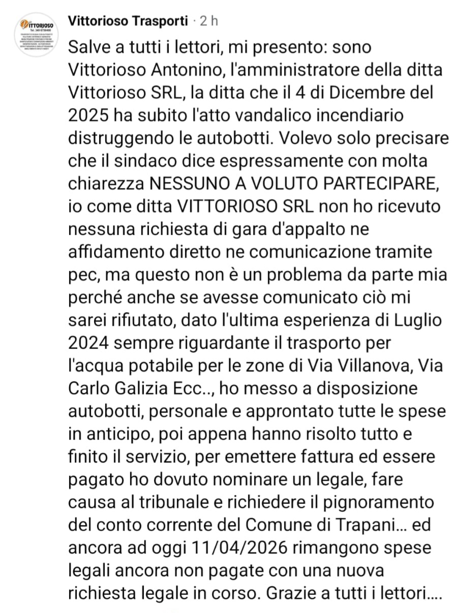 «Sono Vittorioso Antonino, a ditta che il 4 dicembre 2025 ha subito l’atto vandalico incendiario distruggendo le autobotti, sindaco dice che nessuno ha voluto partecipare, ma io non ho ricevuto nessuna richiesta di gara né affidamento diretto né comunicazioni via Pec».