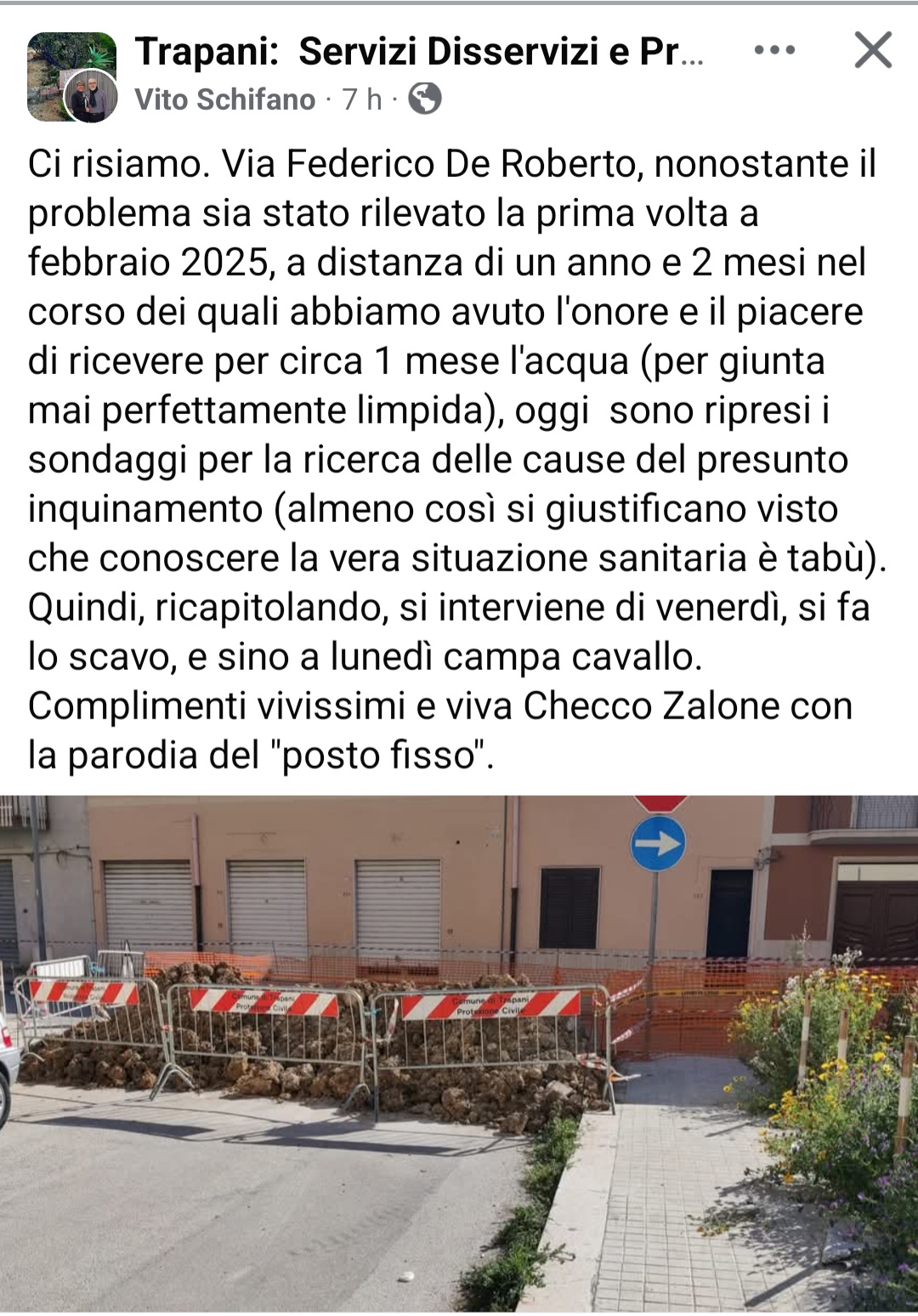 E intanto, tra scavi che si riaprono, autobotti che mancano e cittadini che pagano di tasca propria, Trapani continua a muoversi in bilico tra emergenza e normalità, senza una risposta stabile a un bisogno essenziale: l'acqua.