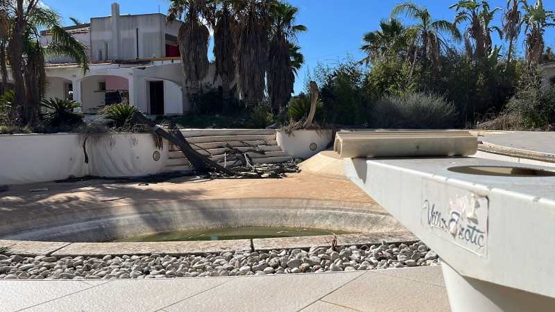 La piscina vuota, le porte sfondate, la sensazione amara di una bellezza sprecata.