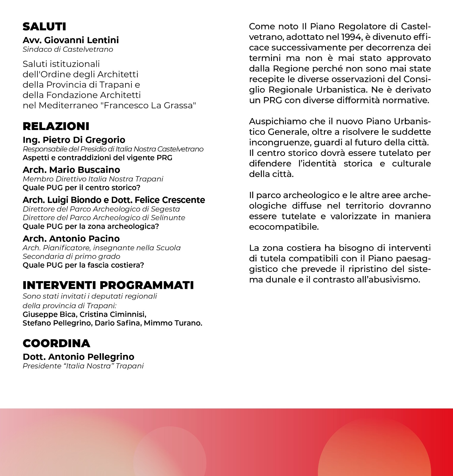 1. Ing. Pietro Di Gregorio (Responsabile Italia Nostra Castelvetrano): aprirà i lavori analizzando gli aspetti e le contraddizioni del vigente PRG.
