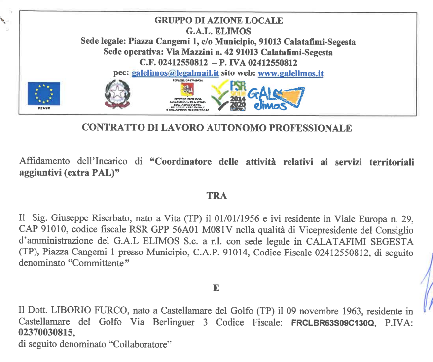Il riferimento è a un contratto di lavoro autonomo professionale, firmato l’8 maggio 2023, con cui il Giuseppe Riservato, nella sua qualità di vicepresidente del Consiglio di amministrazione del Gal Elimos, affida un incarico professionale al Liborio Furco, che nello stesso periodo ricopre la carica di presidente dell’ente.