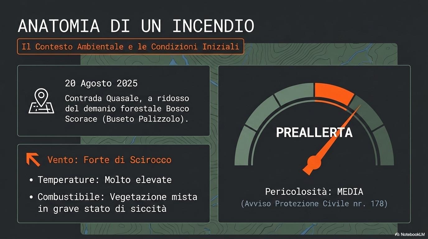 L’innesco: le fiamme a ridosso del bosco Sono circa le 16 quando l’incendio inizia a divampare in contrada Quasale, nel territorio di Buseto Palizzolo. Un’area rurale fatta di terreni coltivati e incolti, a ridosso del Bosco Scorace, già devastato dal rogo del 2022. Le condizioni meteo fanno il resto. Il vento di scirocco alimenta le fiamme, la vegetazione secca le fa correre. Il rogo si allarga rapidamente e punta verso il bosco demaniale. Alle 16:30 sul posto arriva il Corpo Forestale. A dirigere le operazioni è l’ispettore superiore Francesco Cammisa, che assume il ruolo di Direttore delle operazioni di spegnimento. Da quel momento inizia una corsa contro il tempo per evitare che il fuoco diventi indomabile. Per spegnere le fiamme prima che arrivi la notte, perchè col buio i mezzi aerei non volano, e resta solo l’attesa.