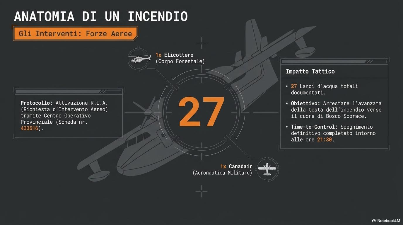 La macchina dei soccorsi Le squadre di terra intervengono subito. Operai forestali e volontari si dispongono lungo il fronte del fuoco per cercare di contenerlo. Ma non basta. Viene richiesto l’intervento dei mezzi aerei. In azione entrano un elicottero e un Canadair. Nel corso delle operazioni verranno effettuati complessivamente 27 lanci d’acqua. Il fuoco minaccia seriamente il Bosco Scorace. Per evitare che le fiamme entrino nella riserva, vengono attuate anche operazioni di contenimento lungo i margini del bosco. La strategia è chiara: proteggere il cuore dell’area demaniale, anche a costo di sacrificare le zone circostanti.
