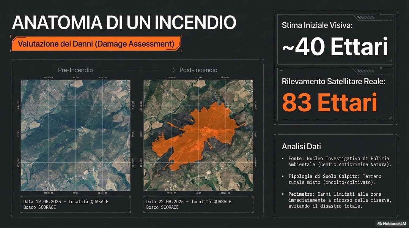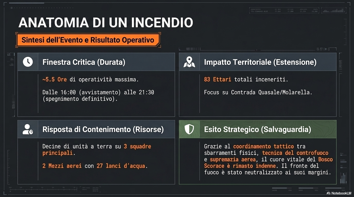Il bilancio Alla fine il conto è pesante. Le fiamme hanno devastato un’area di circa 83 ettari, tra terreni coltivati e incolti. Vegetazione distrutta, paesaggio annerito. Il Bosco Scorace, però, è salvo. Un risultato ottenuto grazie all’intervento coordinato delle squadre di terra e dei mezzi aerei. Senza quel lavoro, il bilancio sarebbe stato molto più grave.