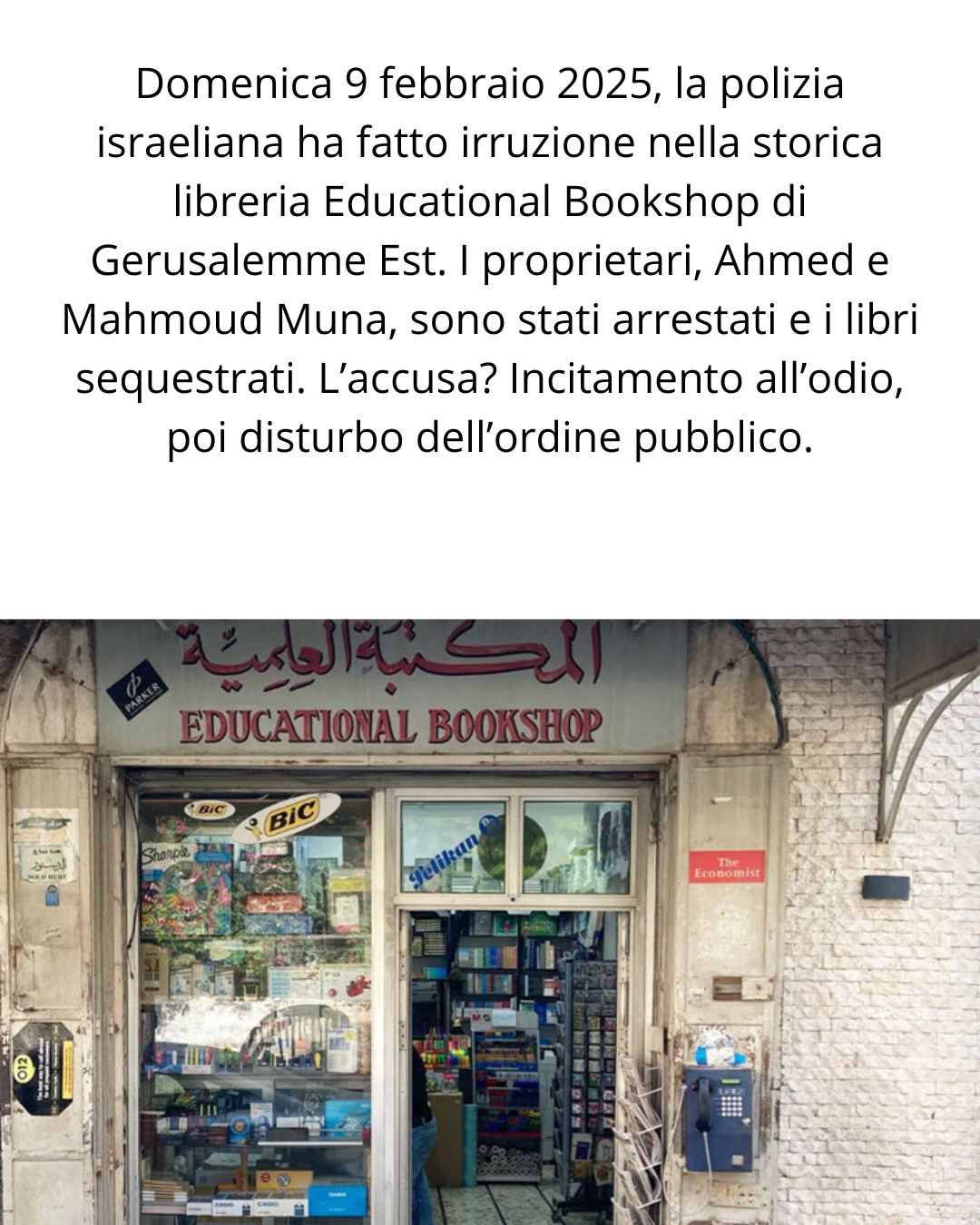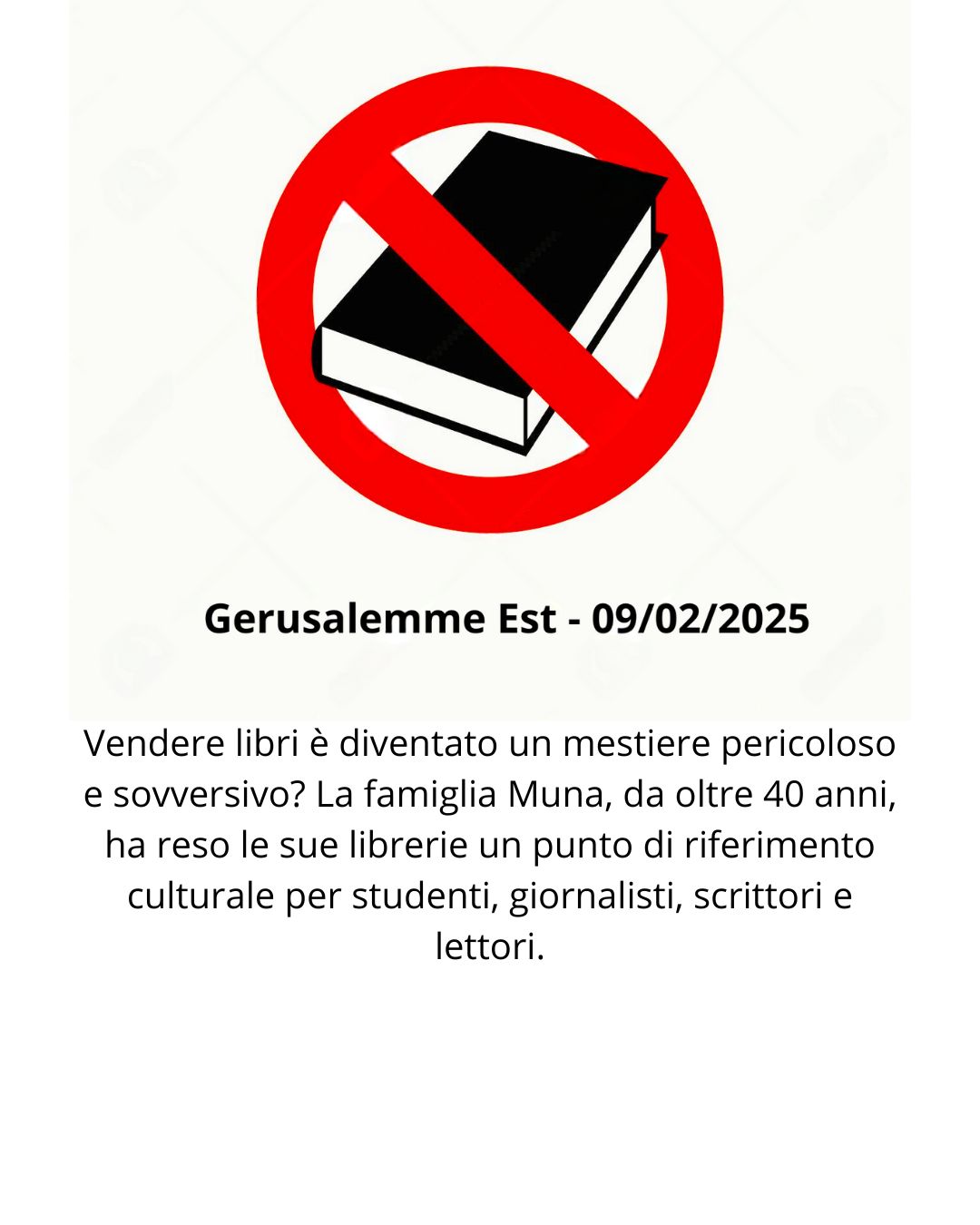 L’ispirazione per questa puntata nasce da un recente fatto di cronaca: due storiche librerie di Gerusalemme Est occupata, specializzate in testi sulla storia e l’identità palestinese, sono state prese di mira dalla polizia israeliana, che ha effettuato un raid violento e arrestato due titolari. L’episodio ha scatenato l’indignazione di intellettuali, difensori dei diritti umani e osservatori internazionali, tra cui anche figure di spicco italiane, che hanno condannato la repressione della libertà di espressione.