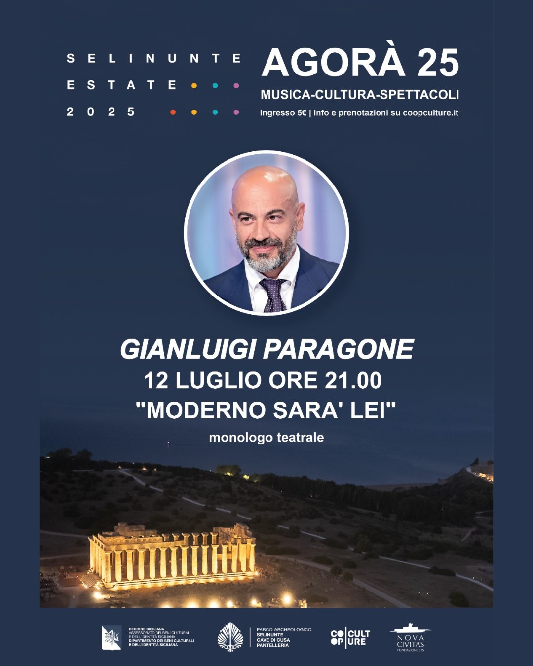 SELINUNTE - Parte sabato 12 luglio alle 21, al Parco archeologico di Selinunte, la rassegna “Agorà”, all’interno del cartellone “Selinunte Estate”. Inaugura Gianluigi Paragone con il monologo teatrale “Moderno sarà lei”, spettacolo tra ricordi anni ’80 e riflessioni sulla società contemporanea. Biglietto: 5 euro, acquistabile su www.coopculture.it o al botteghino. Il programma prosegue il 17 luglio con il giornalista Nicola Porro in dialogo con Livio Marrocco, il 20 luglio con il musical sull’emigrazione “Camicette bianche” di Marco Savatteri, il 1° agosto con il concerto di Sarah Jane Morris accompagnata da Tony Remy, e il 2 agosto con Nick the Nightfly, voce storica di Radio Monte Carlo. MARSALA - Il 12 luglio, Michele Zarrillo sarà protagonista di un concerto a Marsala, in Piazza della Vittoria, nell’ambito del suo Tour 2025. L’ingresso è gratuito.