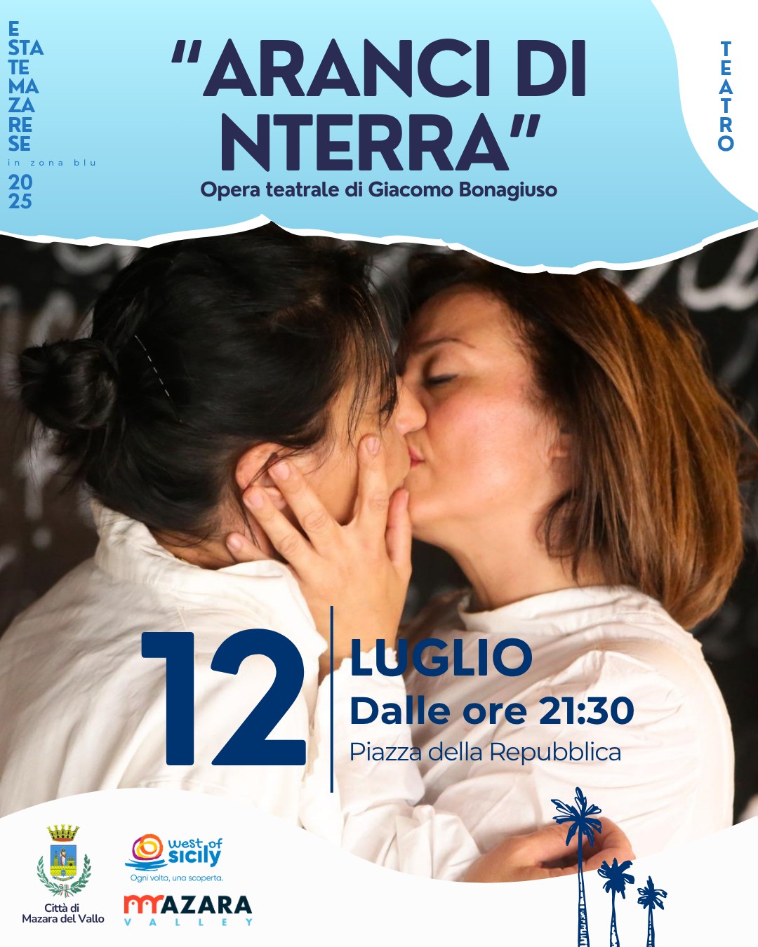 MAZARA DEL VALLO - Sabato 12 luglio 2025, alle ore 21.30 in Piazza della Repubblica a Mazara del Vallo, andrà in scena in anteprima assoluta “Aranci di ‘nterra. Nove storie nella terra delle storie”, spettacolo scritto e diretto da Giacomo Bonagiuso e tratto dal suo omonimo libro. In scena le attrici Liliana Marciante, Giovanna Russo e Giovanna Scarcella, con coreografie di Ciro Venosa e videoproiezioni delle opere di Manuela Marascia. Lo spettacolo, prodotto da Teatro Libero e Kepos Performing Theater, racconta con ironia e profondità le contraddizioni della Sicilia, tra luce e ombra, memoria e denuncia. Ingresso libero fino a esaurimento posti. Sempre a Mazara, domenica 13 luglio si celebra la Festa dell’Incoronazione della Madonna del Paradiso. Si terranno una messa solenne e una processione per le vie del centro storico. Parteciperanno autorità civili, religiose e numerosi fedeli.